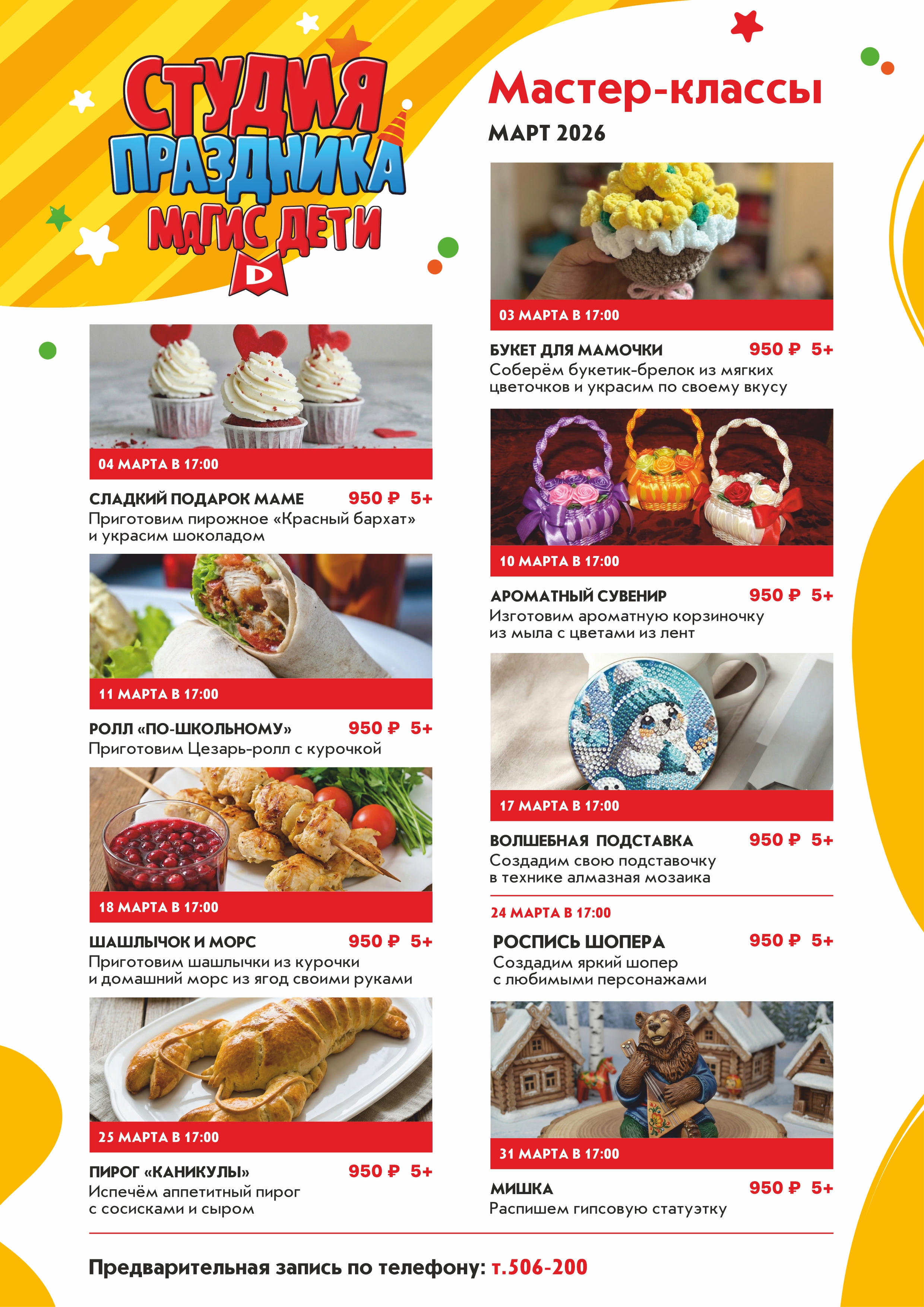 3 марта в 17:00 соберём букетик-брелок из мягких цветочков и украсим на свой вкус 10 марта в 17:00 изготовим ароматную корзиночку из мыла и цветами из лент 17 марта в 17:00 создадим свою подставочку в технике алмазной мозаики 24 марта в 17:00 распишем шоппер изображениями любимых персонажей 31 марта в 17:00 распишем гипсовую статуэтку