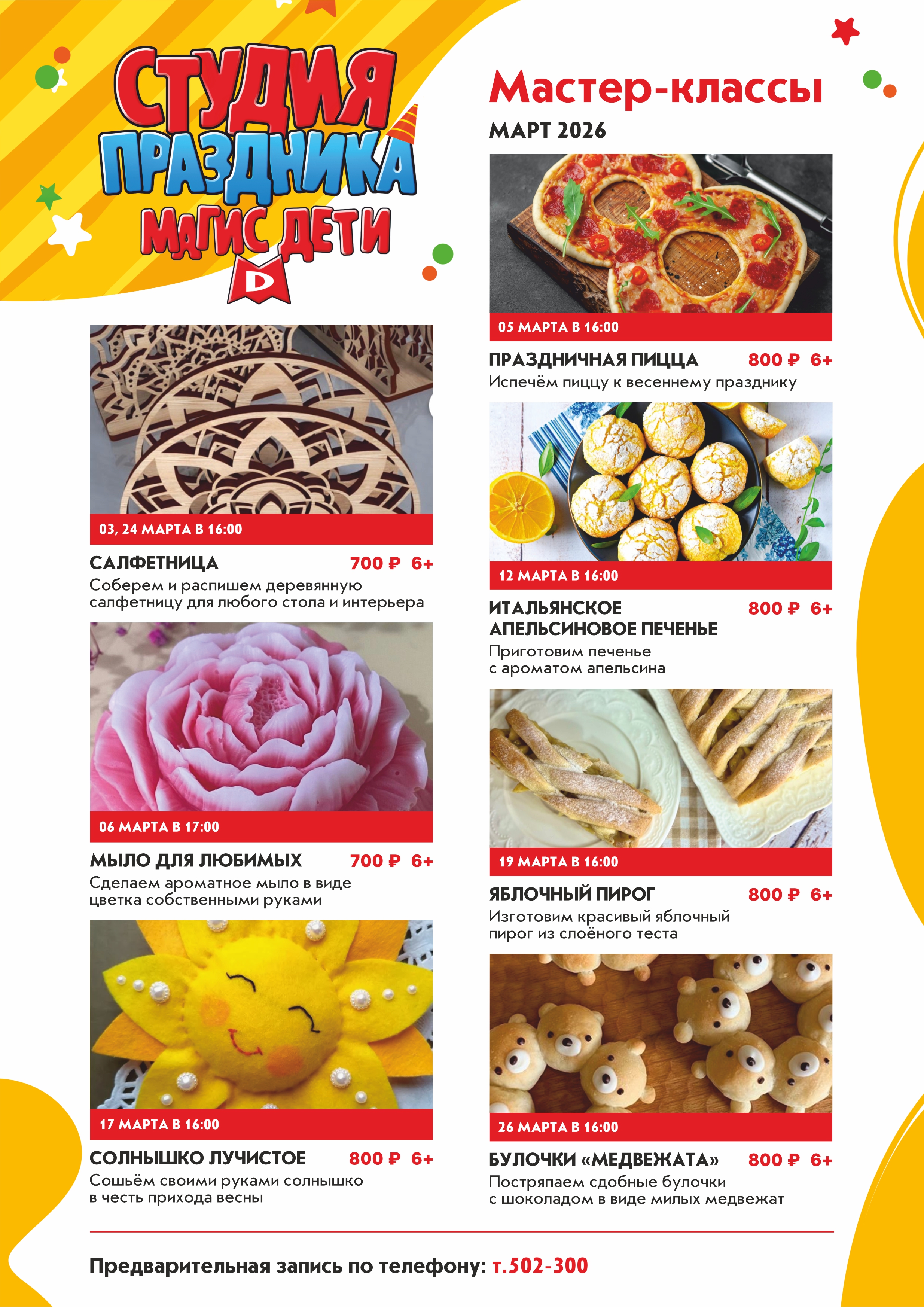 5 марта в 16:00 испечём праздничную пиццу 12 марта в 16:00 приготовим печенье с ароматом апельсина 19 марта в 16:00 изготовим красивый яблочный пирог из слоённого теста 26 марта в 16:00 постряпаем сдобные булочки с шоколадом в виде милых медвежат