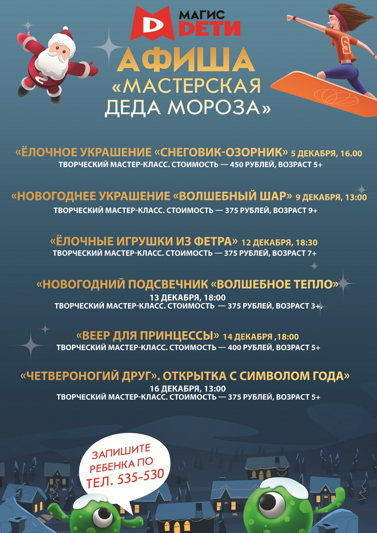 С «Магис Дети» мальчишки и девчонки своими руками смастерят елочные украшения, открытки, рождественские венки, аксессуары к празднику, а на кулинарных мастер-классах попробуют себя в роли поваров и приготовят пиццу и имбирные пряники!