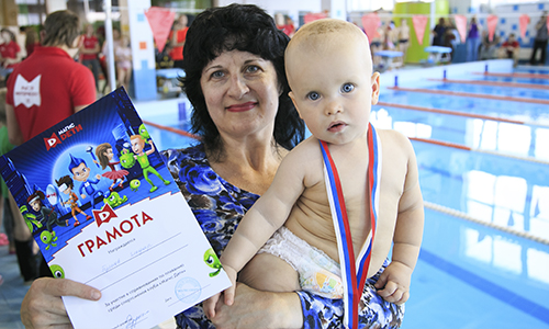 В большом бассейне (25 м.!) наравне со старшими ребятишками свои силы показывали малыши от года до трех. Самому юному участнику на момент соревнований было 364 дня!